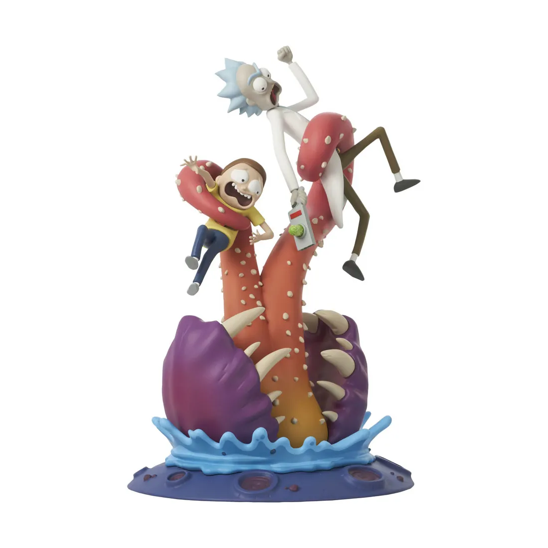 Attention, Morty ! Avec ce le premier objet de collection Rick & Morty de Diamond Select Toys, Rick et son petit-fils Morty se sont faits attrapés par la langue à pointes d’une créature mystérieuse, alors même que Rick pointe son pistolet portail sur le monstre. Mesurant environ 25 cm de hauteur, ce Gallery Diorama est fabriqué en PVC de haute qualité et est emballé dans une boîte à fenêtre en couleur.