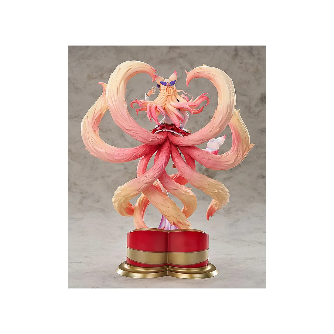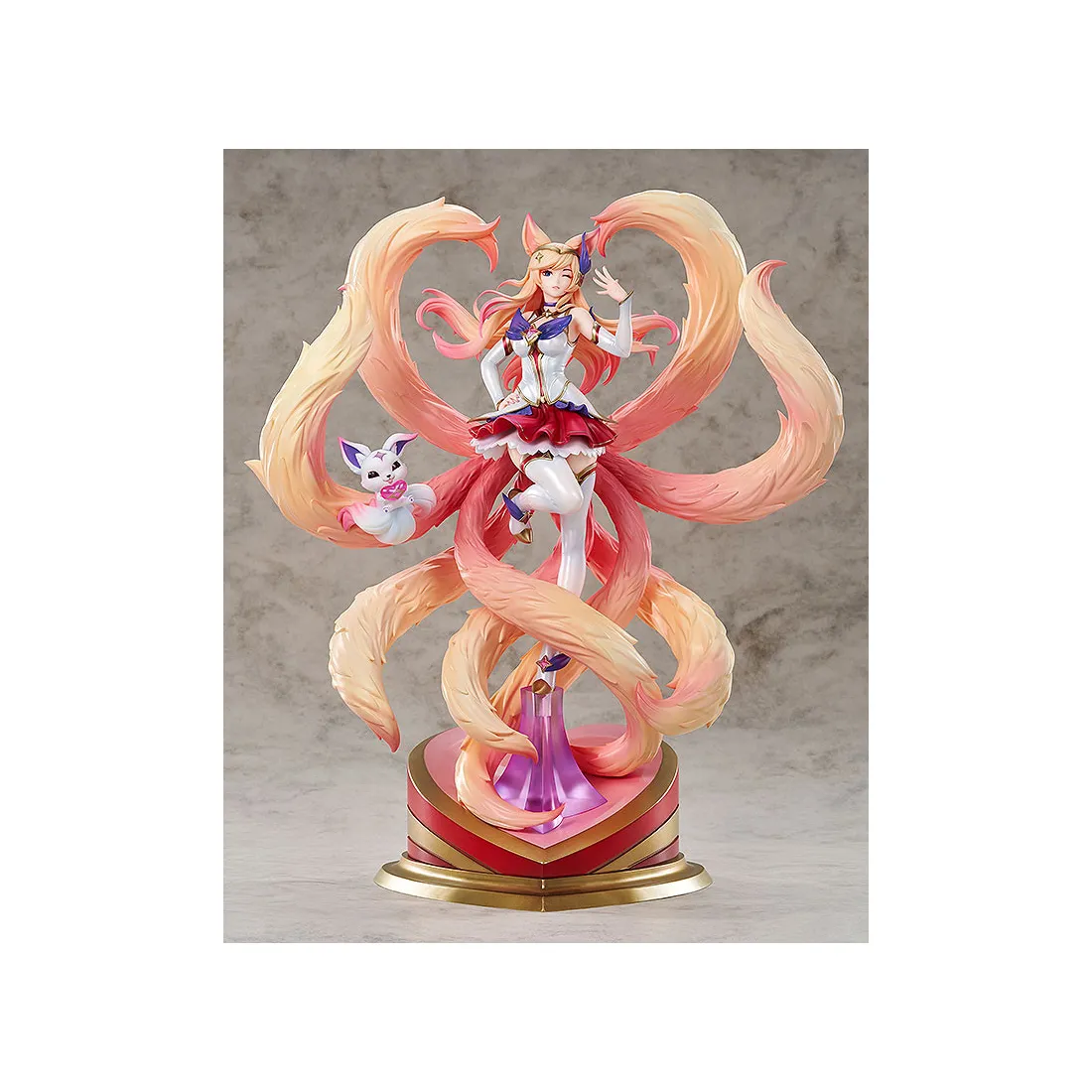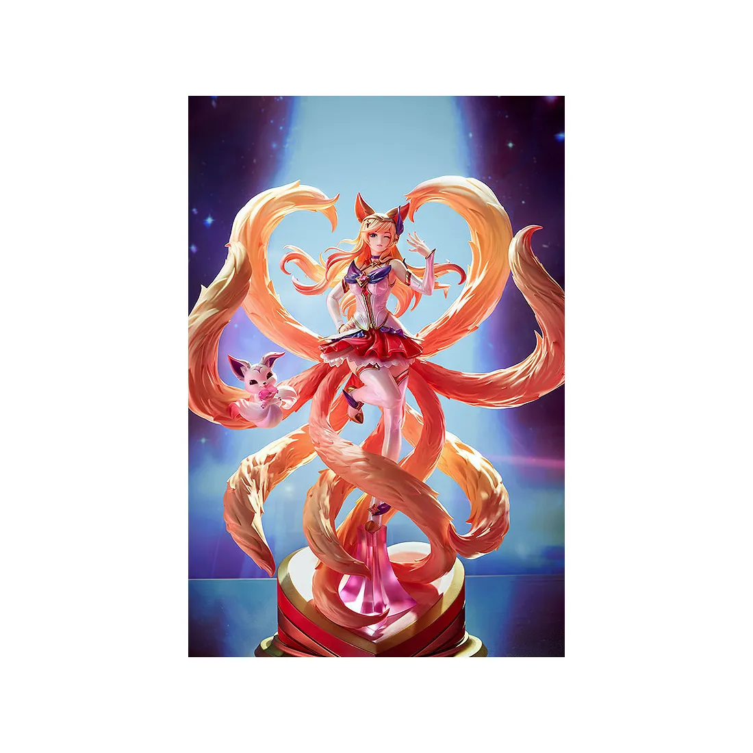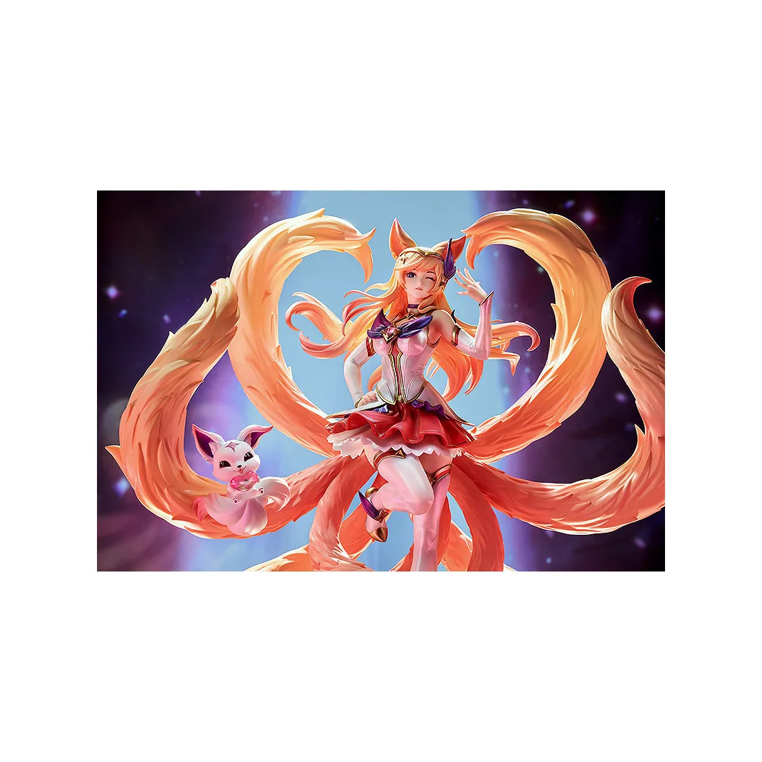 Ahri a été reproduite sous forme de figurine basée sur l’illustration de gardiens des étoiles dans le jeu. Ses longs cheveux ondulants, son expression envoûtante et ses queues volumineuses ne manqueront pas d’attirer votre attention !