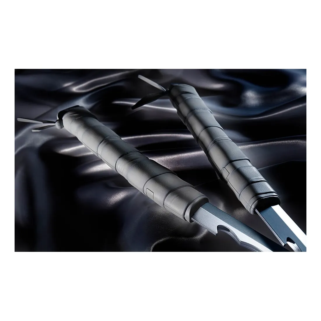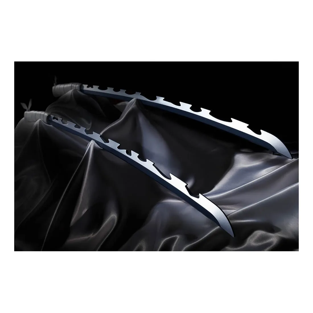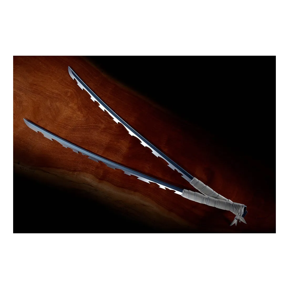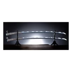 Réplique des deux épées Nichirin (Inosuke Hashibira) en PVC et métal avec support d’exposition. Inclut une fonction sonore