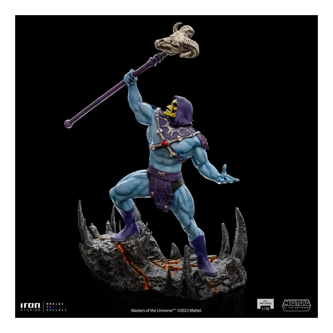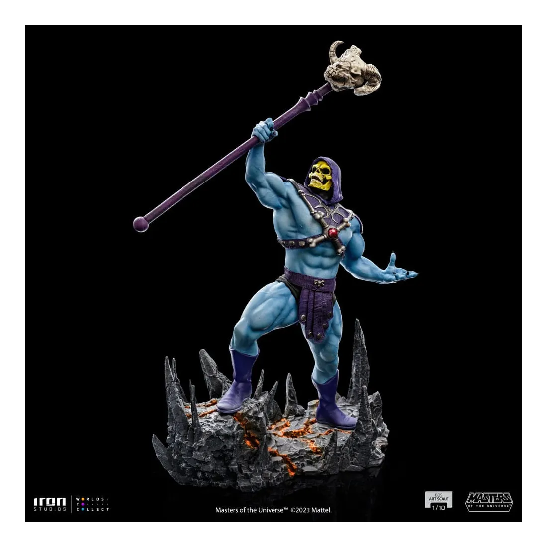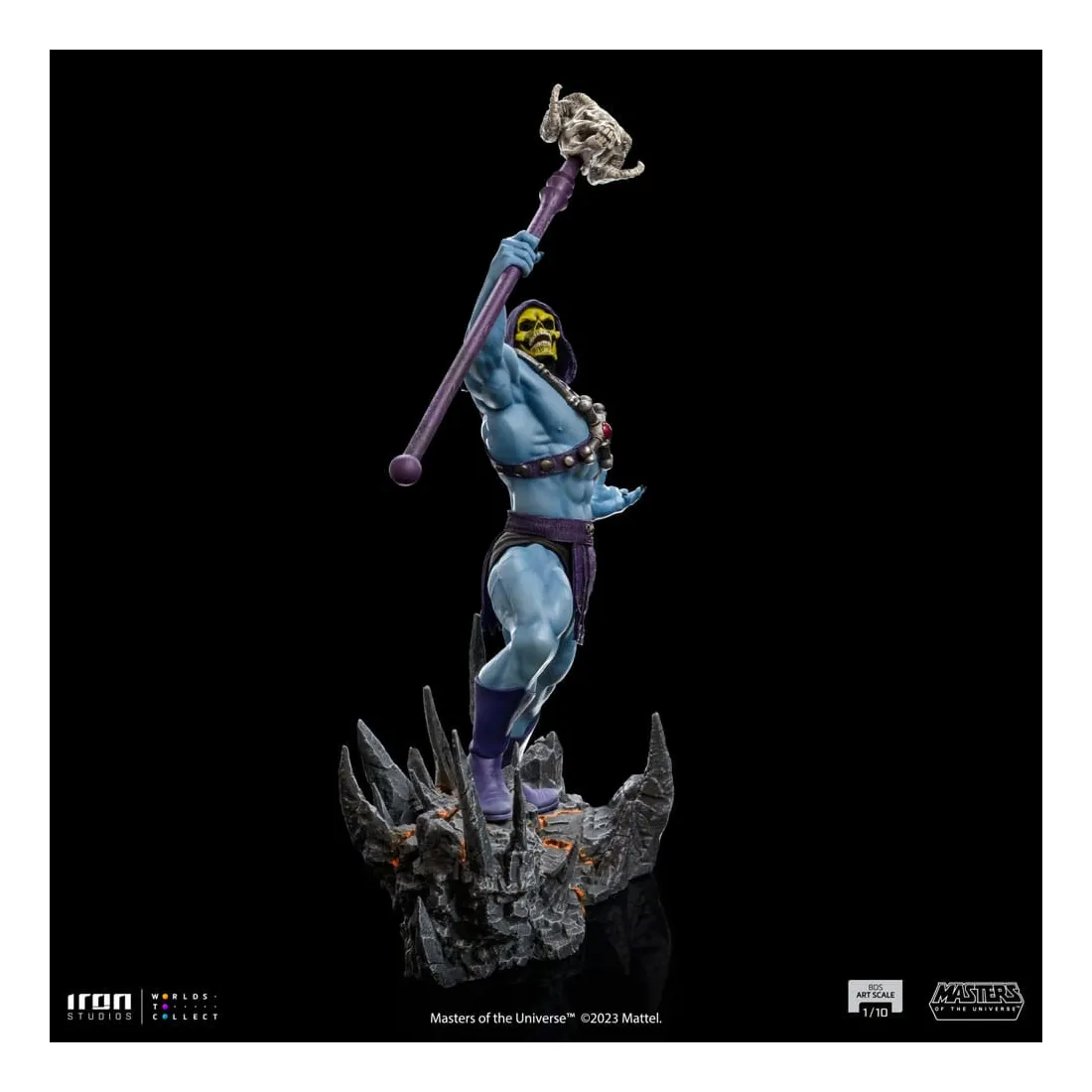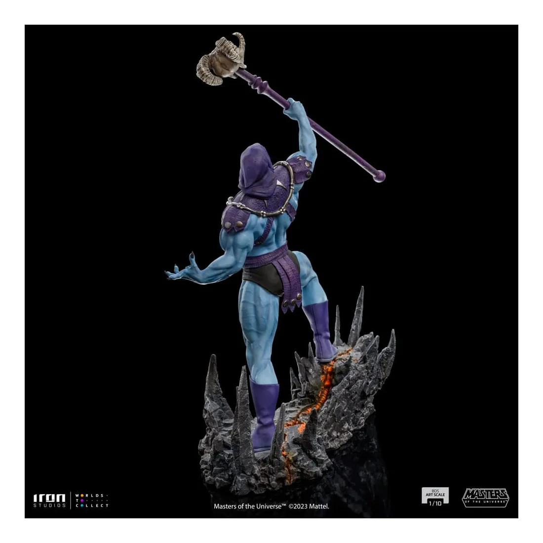 Triomphant sur son nouveau territoire, le puissant sorcier lève son bâton Havok, une arme mystique représentée comme un long sceptre couronné d’un crâne de bélier, utilisé principalement pour lancer des sorcelleries et canaliser sa magie. Redouté à la fois par ses ennemis et ses alliés, le méchant au corps musclé, à la peau bleue et au visage crânien impose ses plans de conquête et de pouvoir dans l’hémisphère sombre désolé de la planète Eternia, contrôlant d’une poigne de fer ses domaines dans la Montagne du Serpent. Sur une base dans laquelle des rochers pointus émergent du sol comme des crocs de serpent, et des crevasses au sol dessinent un système vasculaire intrinsèque et complexe de lave incandescente, Iron Studios présente fièrement leur statue « Skeletor – Masters of the Universe – BDS Art Scale 1 /10 », avec le plus grand ennemi juré de He-Man dans une nouvelle version pour la collection de statues MOTU d’Iron Studios, exauçant le souhait des fans et des collectionneurs.