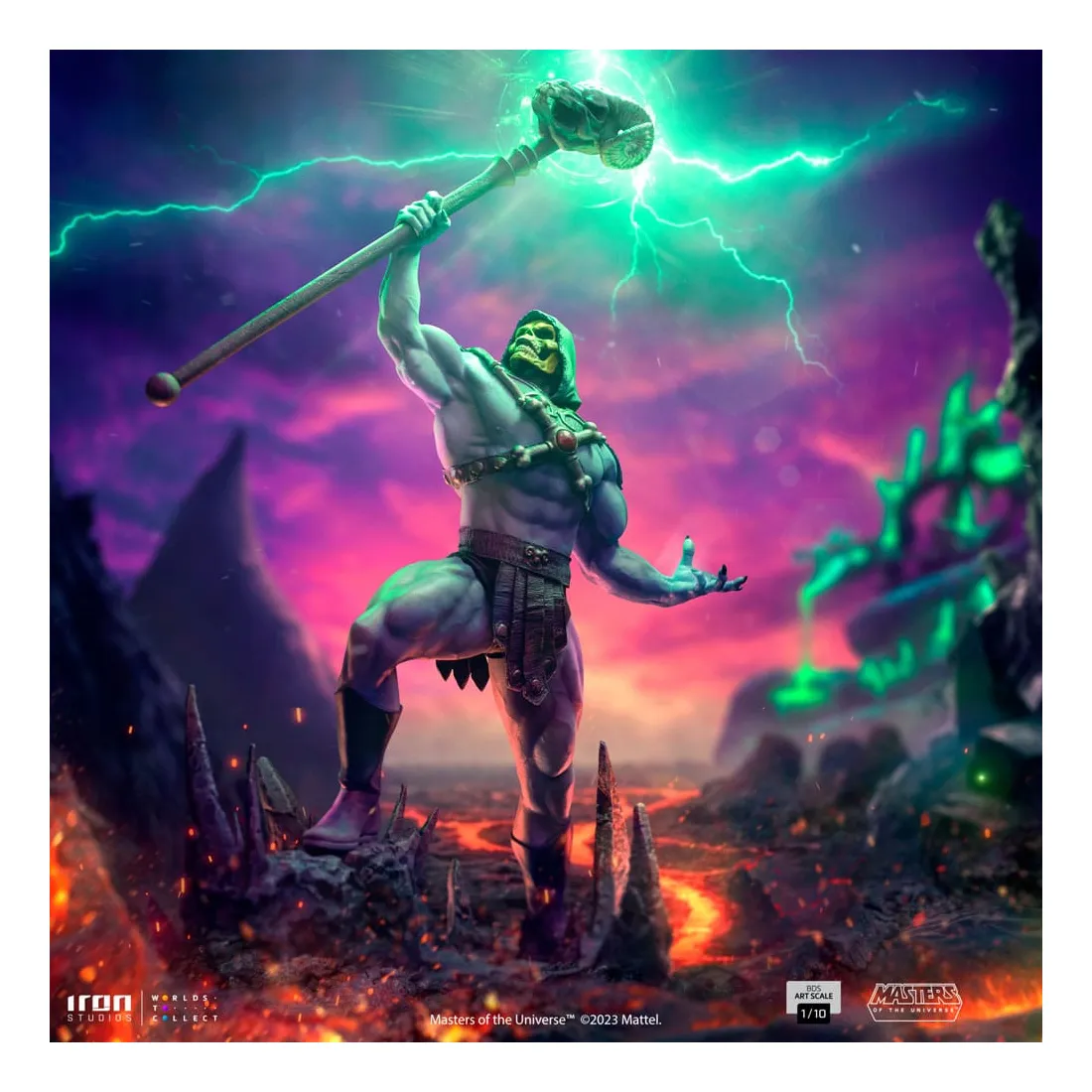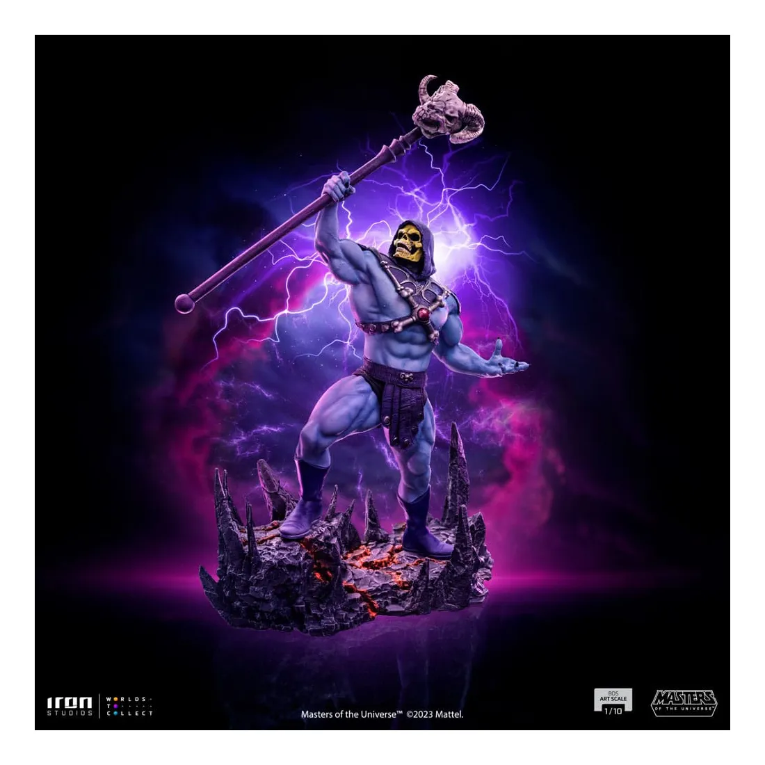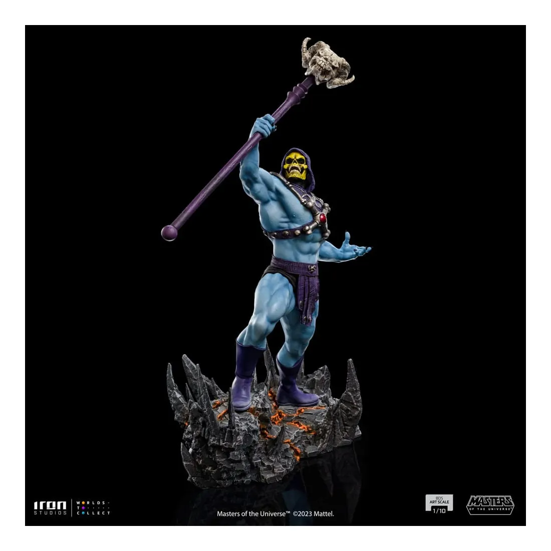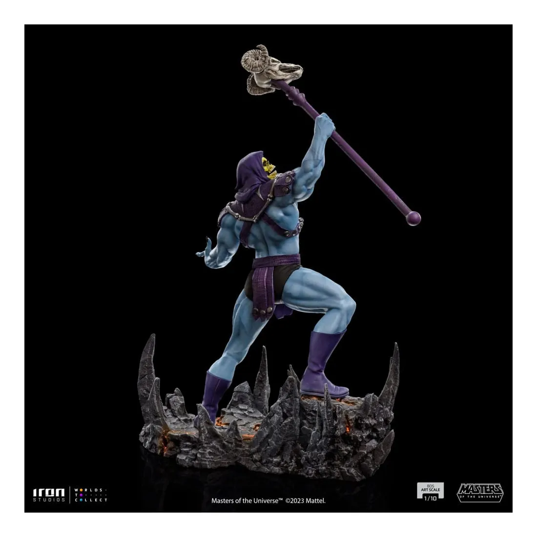 Triomphant sur son nouveau territoire, le puissant sorcier lève son bâton Havok, une arme mystique représentée comme un long sceptre couronné d’un crâne de bélier, utilisé principalement pour lancer des sorcelleries et canaliser sa magie. Redouté à la fois par ses ennemis et ses alliés, le méchant au corps musclé, à la peau bleue et au visage crânien impose ses plans de conquête et de pouvoir dans l’hémisphère sombre désolé de la planète Eternia, contrôlant d’une poigne de fer ses domaines dans la Montagne du Serpent. Sur une base dans laquelle des rochers pointus émergent du sol comme des crocs de serpent, et des crevasses au sol dessinent un système vasculaire intrinsèque et complexe de lave incandescente, Iron Studios présente fièrement leur statue « Skeletor – Masters of the Universe – BDS Art Scale 1 /10 », avec le plus grand ennemi juré de He-Man dans une nouvelle version pour la collection de statues MOTU d’Iron Studios, exauçant le souhait des fans et des collectionneurs.