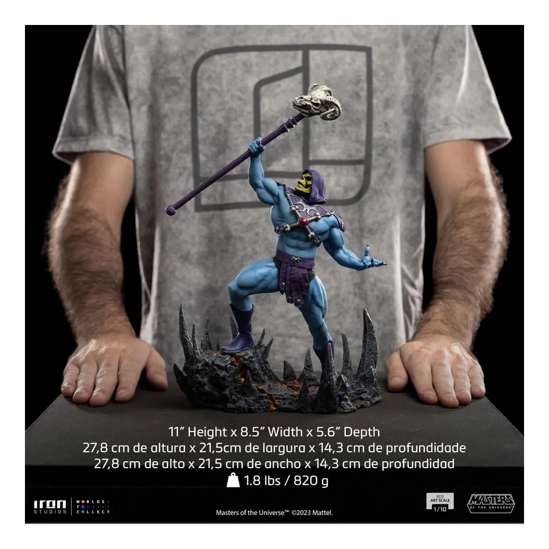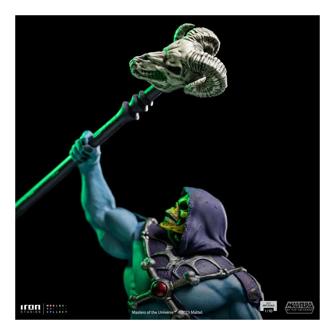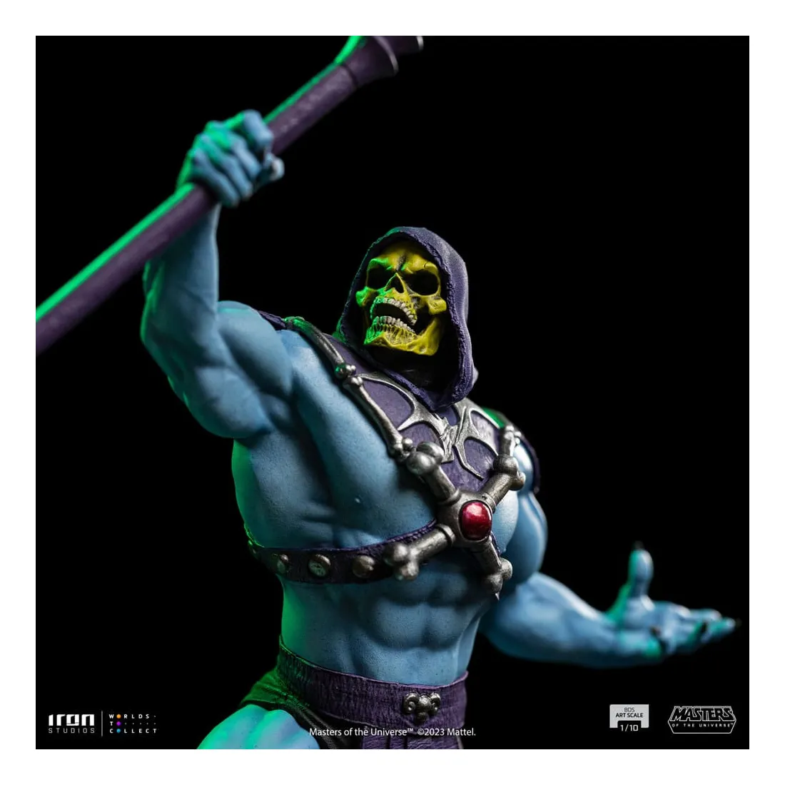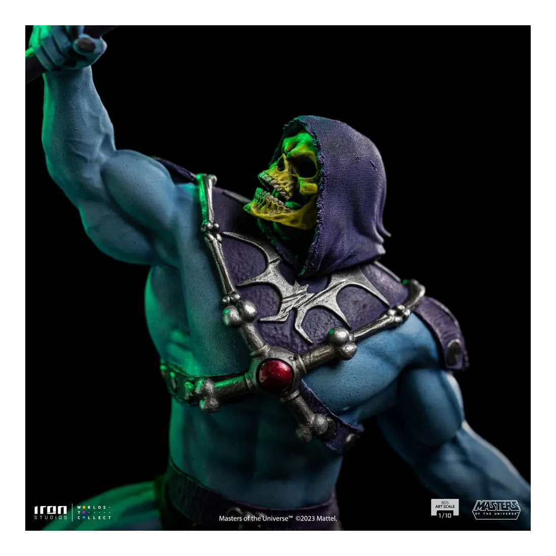 Triomphant sur son nouveau territoire, le puissant sorcier lève son bâton Havok, une arme mystique représentée comme un long sceptre couronné d’un crâne de bélier, utilisé principalement pour lancer des sorcelleries et canaliser sa magie. Redouté à la fois par ses ennemis et ses alliés, le méchant au corps musclé, à la peau bleue et au visage crânien impose ses plans de conquête et de pouvoir dans l’hémisphère sombre désolé de la planète Eternia, contrôlant d’une poigne de fer ses domaines dans la Montagne du Serpent. Sur une base dans laquelle des rochers pointus émergent du sol comme des crocs de serpent, et des crevasses au sol dessinent un système vasculaire intrinsèque et complexe de lave incandescente, Iron Studios présente fièrement leur statue « Skeletor – Masters of the Universe – BDS Art Scale 1 /10 », avec le plus grand ennemi juré de He-Man dans une nouvelle version pour la collection de statues MOTU d’Iron Studios, exauçant le souhait des fans et des collectionneurs.