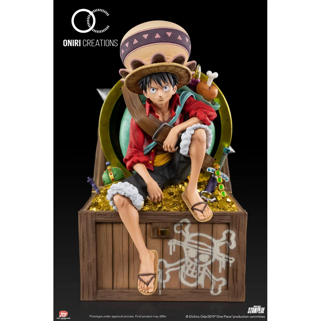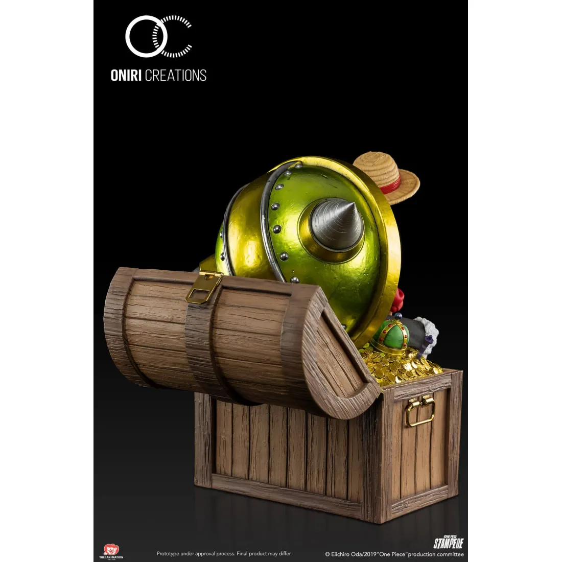 Reprenant la pose emblématique du poster de One Piece Stampede, Luffy trône fièrement sur son trésor. Il porte un casque de géant de l’île d’Elbaf, ainsi qu’un sac rempli de victuailles.